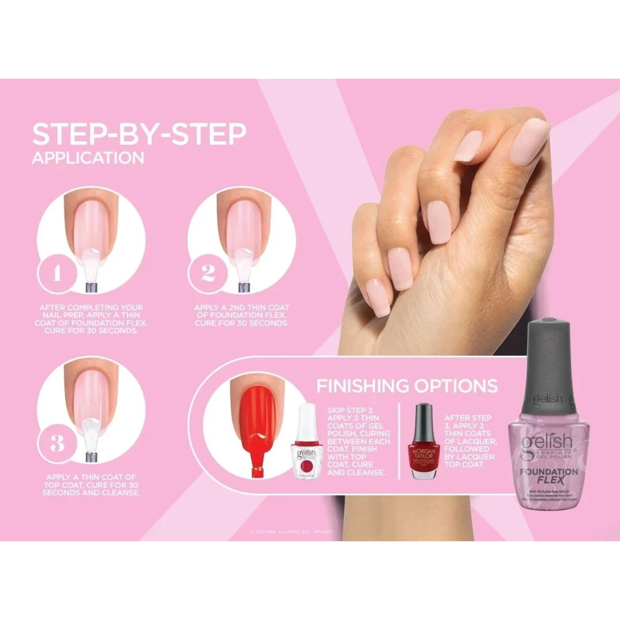 Gelish se complace en anunciar la expansión de la familia Foundation con el gel para uñas Foundation Flex Soak-Off Rubber Base. Foundation Flex funciona como una capa base con la adhesión Gelish en la que confías, ¡PERO también hace mucho más!